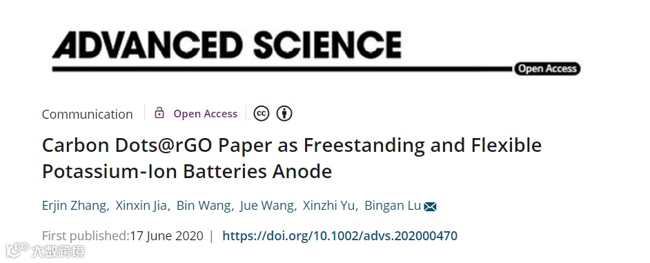 [5] Erjin Zhang, Xinxin Jia, Bin Wang, Jue Wang, Xinzhi Yu, and Bingan Lu*. Carbon Dots@rGO Paper as Freestanding and Flexible Potassium-Ion Batteries Anode. Advanced Science, 2020, Doi/10.1002/advs.202000470
