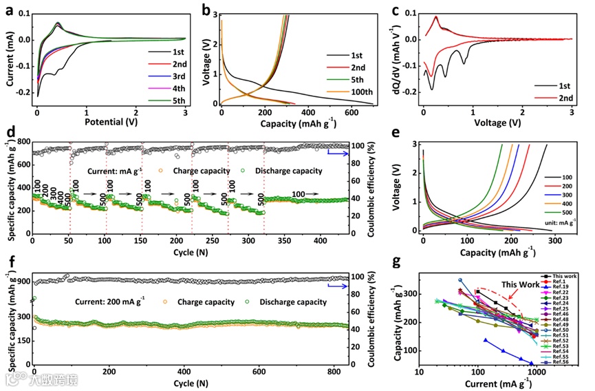 这种独立且灵活的CDs@rGO负极在100 mA g-1的电流密度下具有310 mAh g-1的高比容量,初始库伦效率(ICE)约为44.4%;在200 mA g-1的电流密度下循环840次后仍保持244 mAh g-1的比容量;即使经历连续6次电流变化后,在500 mA g-1的高电流密度下也可以提供185 mAh g-1的比容量。通过引入碳点来增强电化学性能的策略可以为其他研究领域提供新的思路和视野。