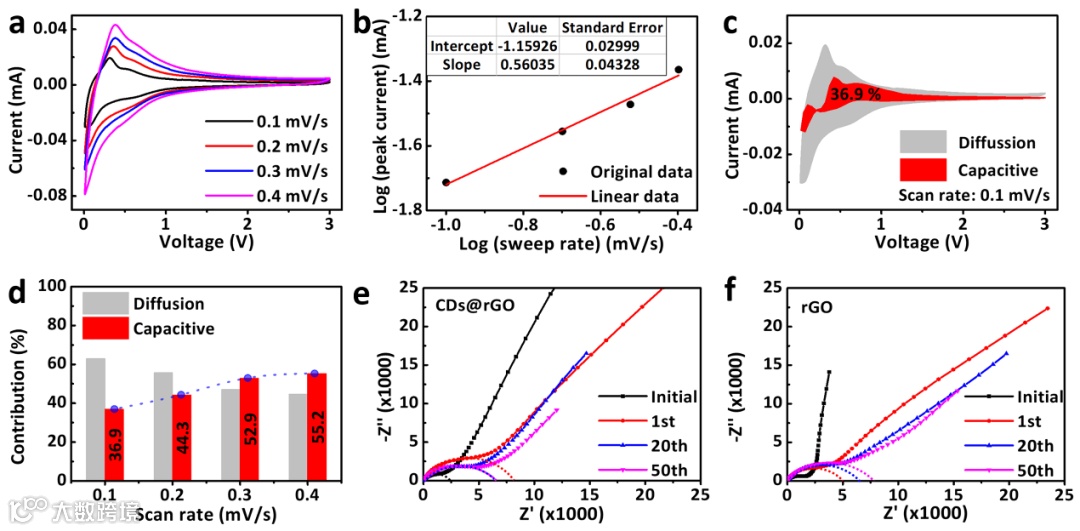 a) The CV curves for CDs@rGO half-cells from 0.1 to 0.4 mV/s.