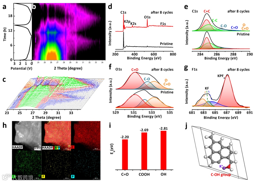 研究发现碳点的引入对氧化石墨烯表面结构及化学键有很大影响,并导致电化学性能的变化。电化学性能测试结果结合循环伏安法及原位XRD测试表明,碳点的引入使还原氧化石墨烯的储钾机制从嵌钾/脱钾转变为嵌钾/脱钾与吸附/脱附共同作用,显著提高其比容量,改善循环性能和倍率性能,使还原氧化石墨烯快速可逆储K+成为可能。
