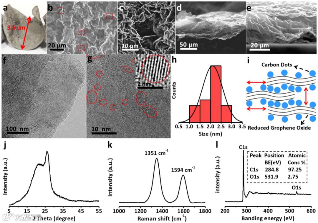 j) XRD patterns of CDs@rGO film paper.