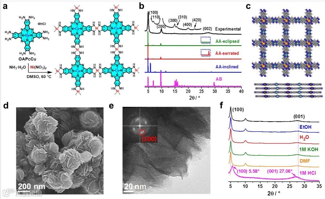 图1. 粉末状Ni2[CuPc(NH)8] 2D c-MOF的表征
