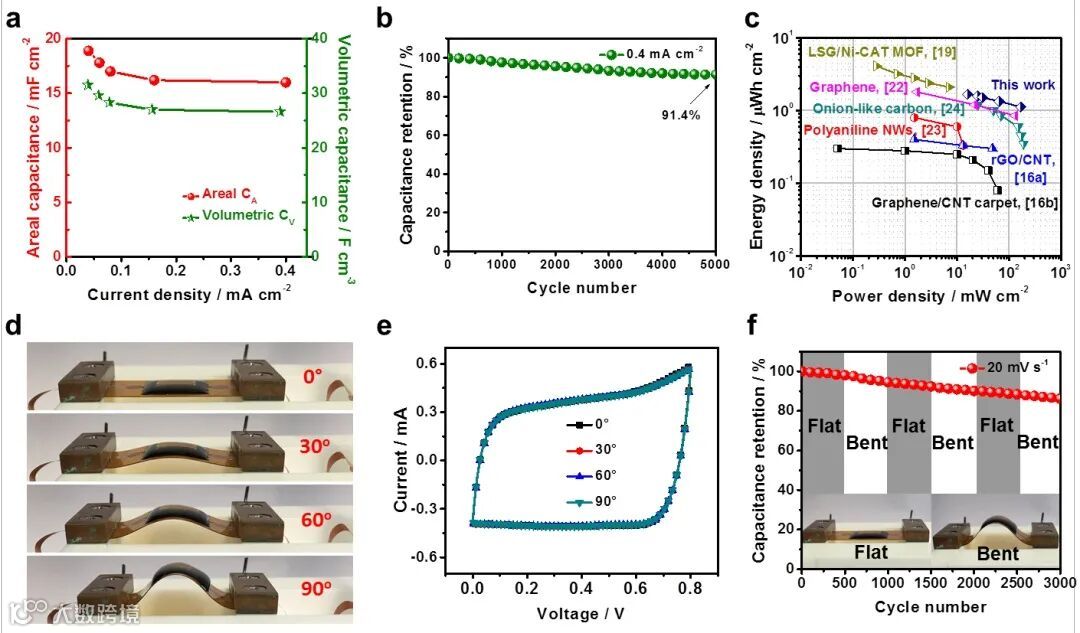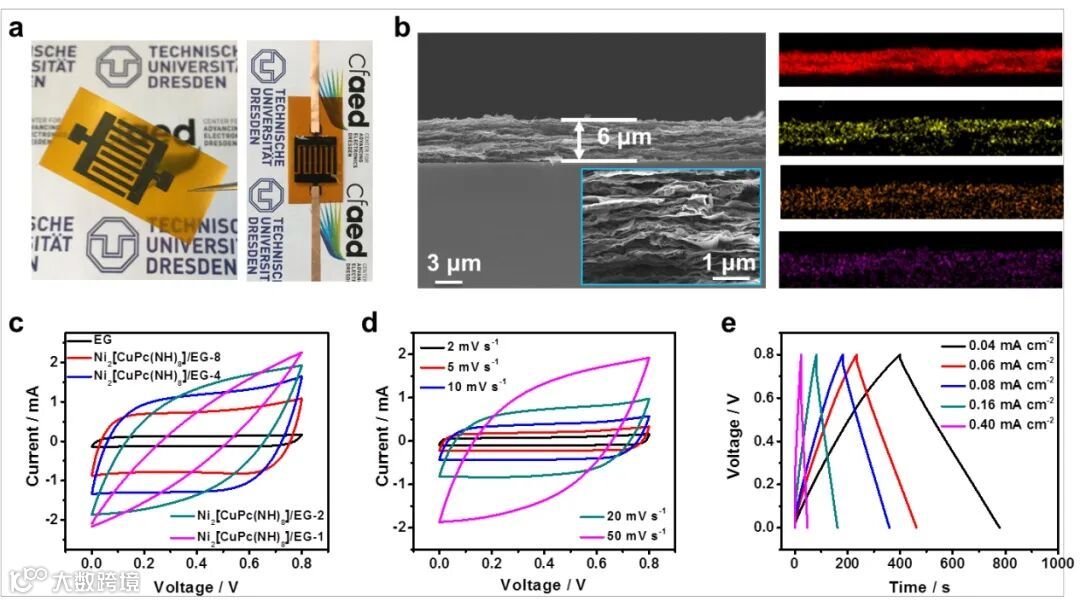 受益于其多孔性、电导性和超薄的特性,Ni2[CuPc(NH)8]纳米薄片保证了高的活性位点利用率和较快的离子传输。因此,通过混合Ni2[CuPc(NH)8]纳米薄片和电化学剥离的石墨烯(EG),薄膜插指电极被简易制备并应用于微型电容器研究中(图3a,b)。