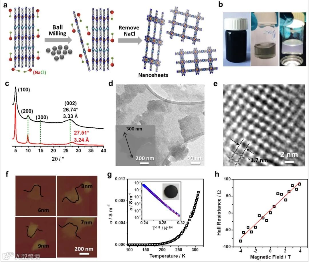 粉末X射线衍射(XRD)图谱显示了其高的结晶性(图1b),通过计算,晶格参数a(相邻Cu原子距离)为18.0埃米,层间距为3.24埃米。基于密度泛函理论的结构建模,上述XRD图谱能够被AA-锯齿状堆积模式良好再现(图1c)。
