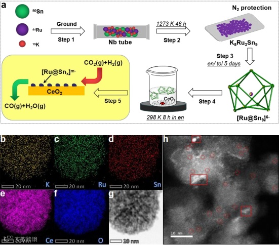 图1显示,Ru-SnOx/CeO2催化剂来源于[Ru@Sn9]6- Zintl团簇,在惰性气体氮气的保护下,将[Ru@Sn9]6-阴离子团簇高效负载在CeO2表面,然后应用于CO2选择加氢实验。