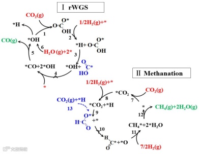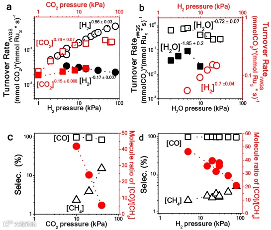 (4)对Ru-SnOx/CeO2催化剂高选择性生成CO的机理进行了全面的研究,结合分压实验和同位素表征手段,阐明逆水煤气和甲烷化反应与表面的HOCO*和HCOO*表面物种的 C-O键断裂有关,讨论产物H2O的分压对产物选择性的调控作用,丰富了单原子催化剂调控CO2加氢产物选择性的策略。