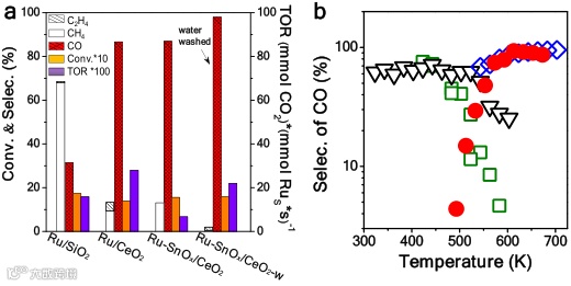 如图2所示,Ru/CeO2比Ru/SiO2 反应活性更高,说明金属Ru与CeO2载体之间存在一定的相互作用,Ru-SnOx/CeO2催化剂展现了更高的CO选择性,水洗后其值达95%以上。