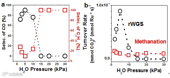 如图5所示,在0~5 KPa,CO选择性随H2O分压增大而增大,而超过5KPa直至15 KPa时,CO选择性下降并最终完全反转为100% CH4。