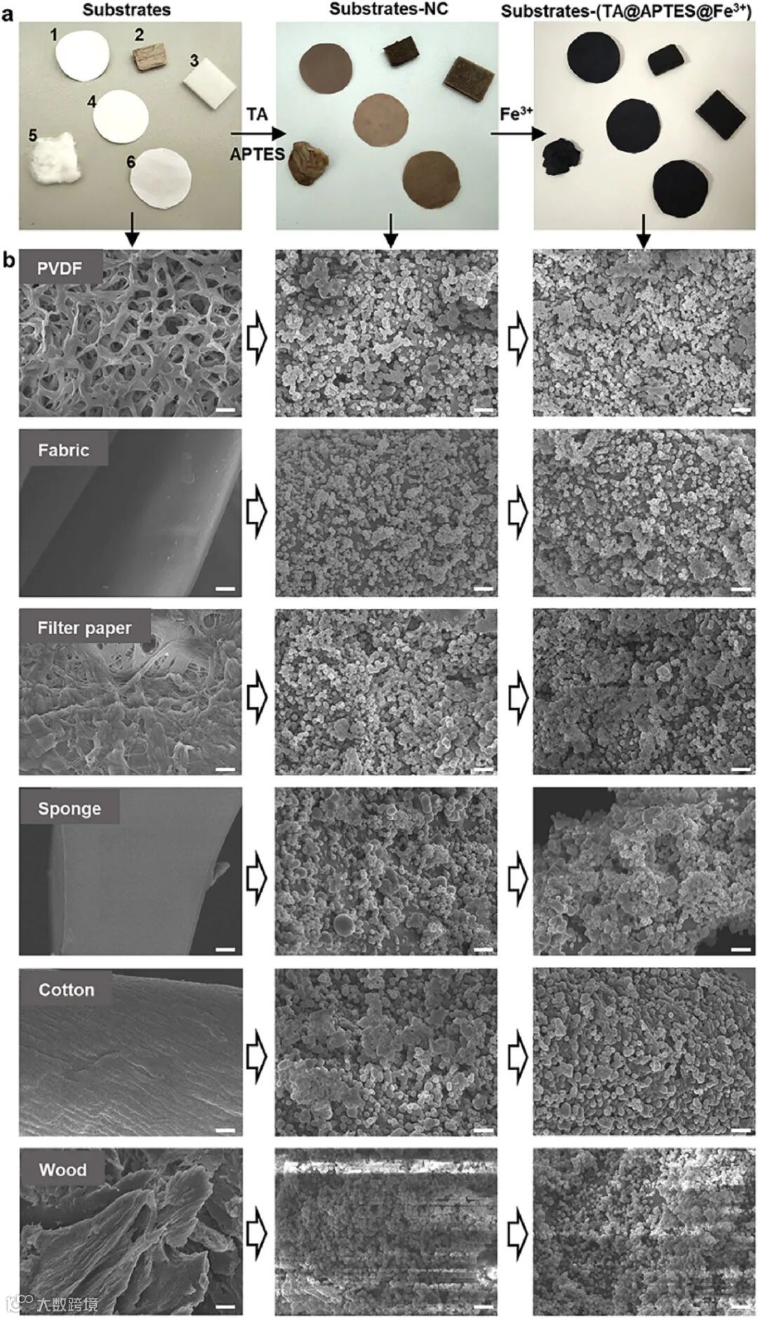 (b) SEM images of the pristine substrates, substrates decorated with nano coating, and substrates decorated with TA@APTES@Fe3+ coating. The scale bar is 1 μm.