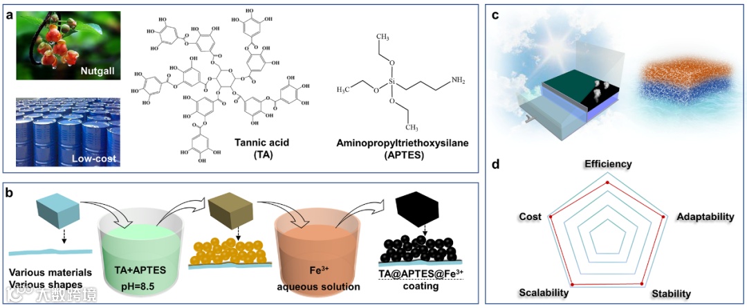 本文作者开发出一种具有多功能性能的新型材料——单宁酸@氨基丙基三乙氧基硅烷@Fe3+(TA@APTES@Fe3+)复合涂层,用于太阳能蒸汽的产生。TA@APTES@Fe3+具有许多优点:宽而强的光吸收,良好的普适性(适用于多种多样的材料),低廉的成本,良好的稳定性,优异的抗油污染性,以及利于多种复杂结构设计的高可扩展性。TA@APTES@Fe3+的这些特性使几乎具有任何结构设计的基底材料都可以轻松地转换成光热材料,从而大幅提高其太阳能光热海水淡化速率。以经过结构设计的杨木为例,其经过TA@APTES@Fe3+处理后,水蒸发速率达到约1.8 kg m-2 h-1(一个太阳光照强度下),这在木基光热材料中是创纪录的。这一技术有望与目前的3D打印技术相结合,通过3D打印技术制备具有优化结构的基材,之后利用该涂层转换为光热材料,将有望大幅提高太阳能海水淡化效率,极大的促进这一领域的发展。