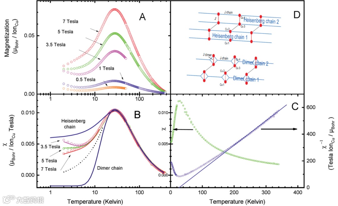 D) Schematic pictures of Heisenberg chains and dimer chains, the models used to fit the magnetic susceptibility data. See Supporting Information for details.