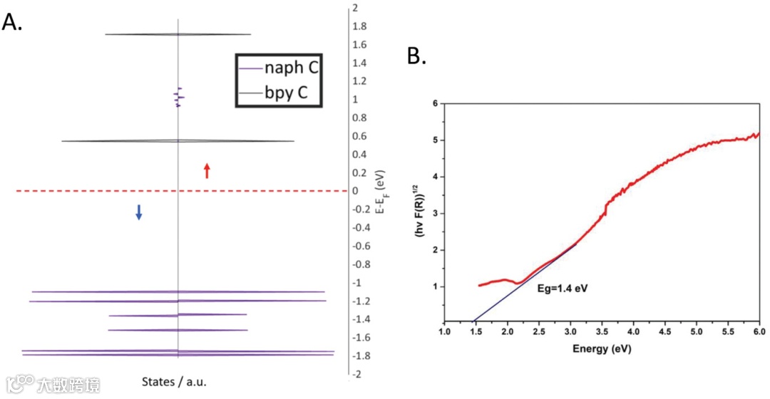 A) Spin‐up and spin‐down projected density of states of the 1,4‐NDPA and 4,4′‐bpy carbons for TUB75 in the AFM configuration.