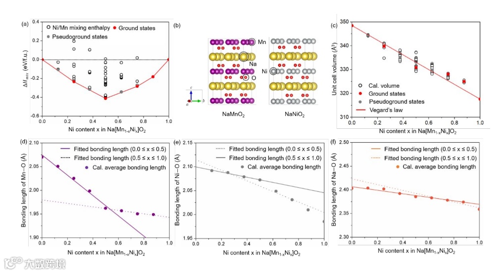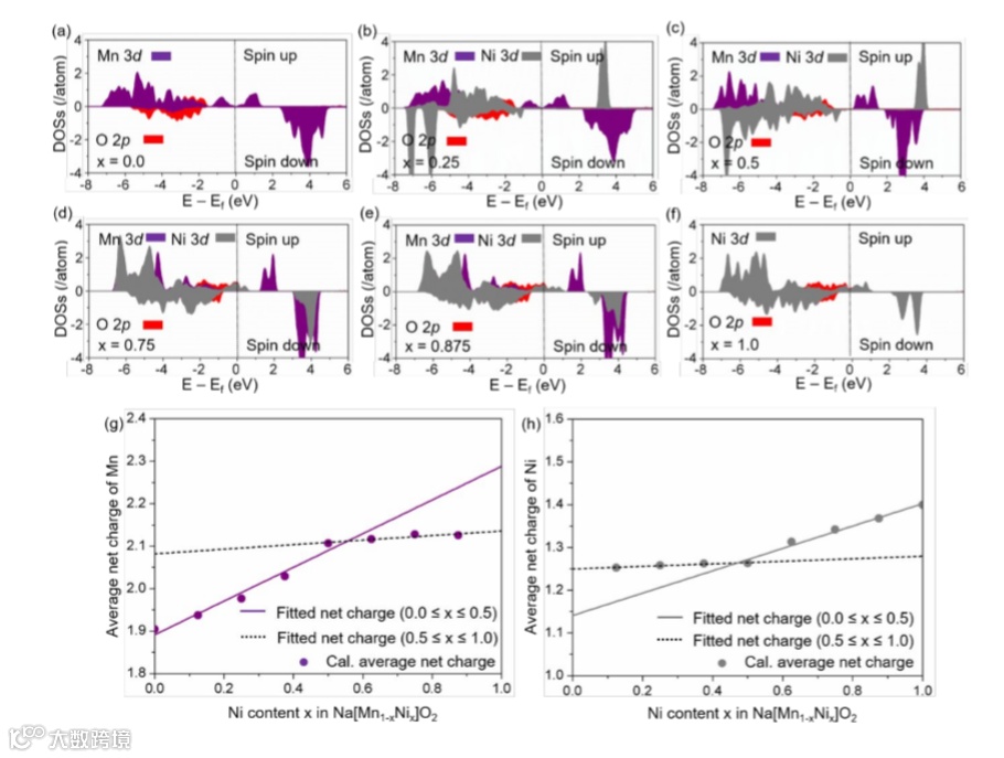 为了揭示Na[Mn1-xNix]O2在改变Ni取代量(x)时热力学和结构性质的预测来源,作者对其TM和氧电子结构进行了详细的研究。图2a-f给出了Na[Mn1-xNix]O2中Mn和Ni 3d-电子和O 2-p-电子在热力学基态(x=0.0、0.25、0.5、0.75、0.875和1.0)下的部分态密度(PDOSs)的组合图。