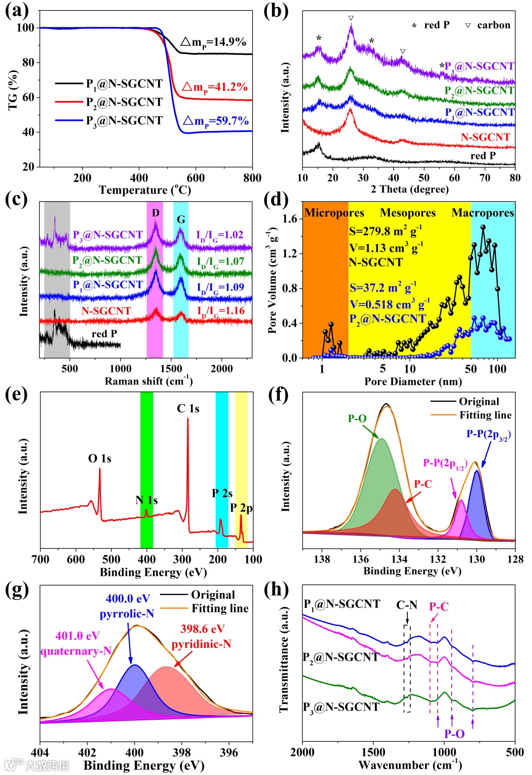从三种P@N-SGCNT复合材料的形貌对比可以发现(图1b-d),当基底材料一定时,随着红磷量的增加,在高温下首先是以纳米状进行复合,超过所能承载的极限值后,由于纳米尺寸效应的存在会时红磷发生团聚。因此,只有在高添加量的P3@N-SGCNT复合材料中能观察到块状红磷的存在(图1d)。