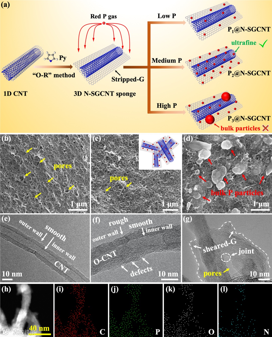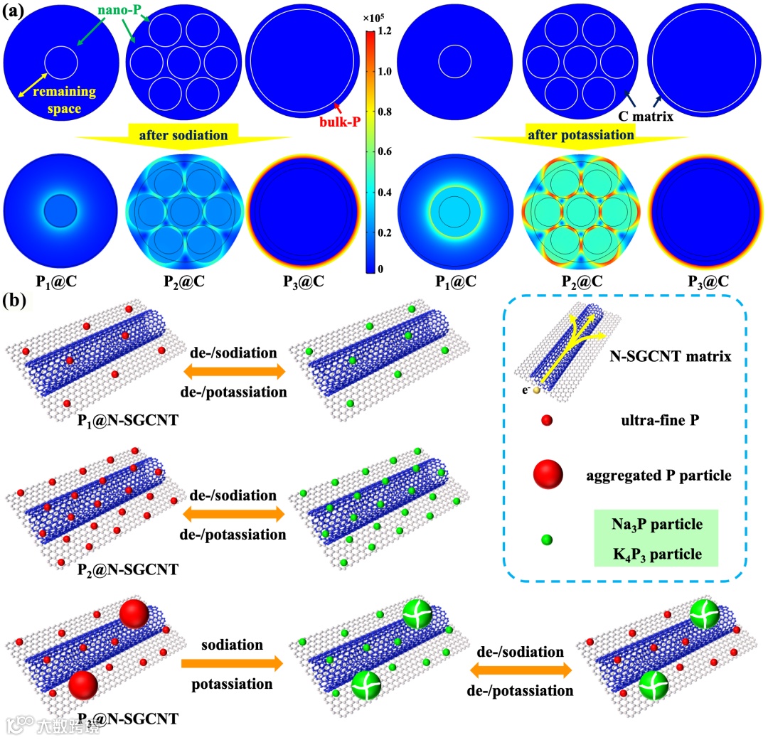P2@N-SGCNT复合材料具有优异储钠和储钾性能,主要得益于高载量纳米红磷的完全限域。