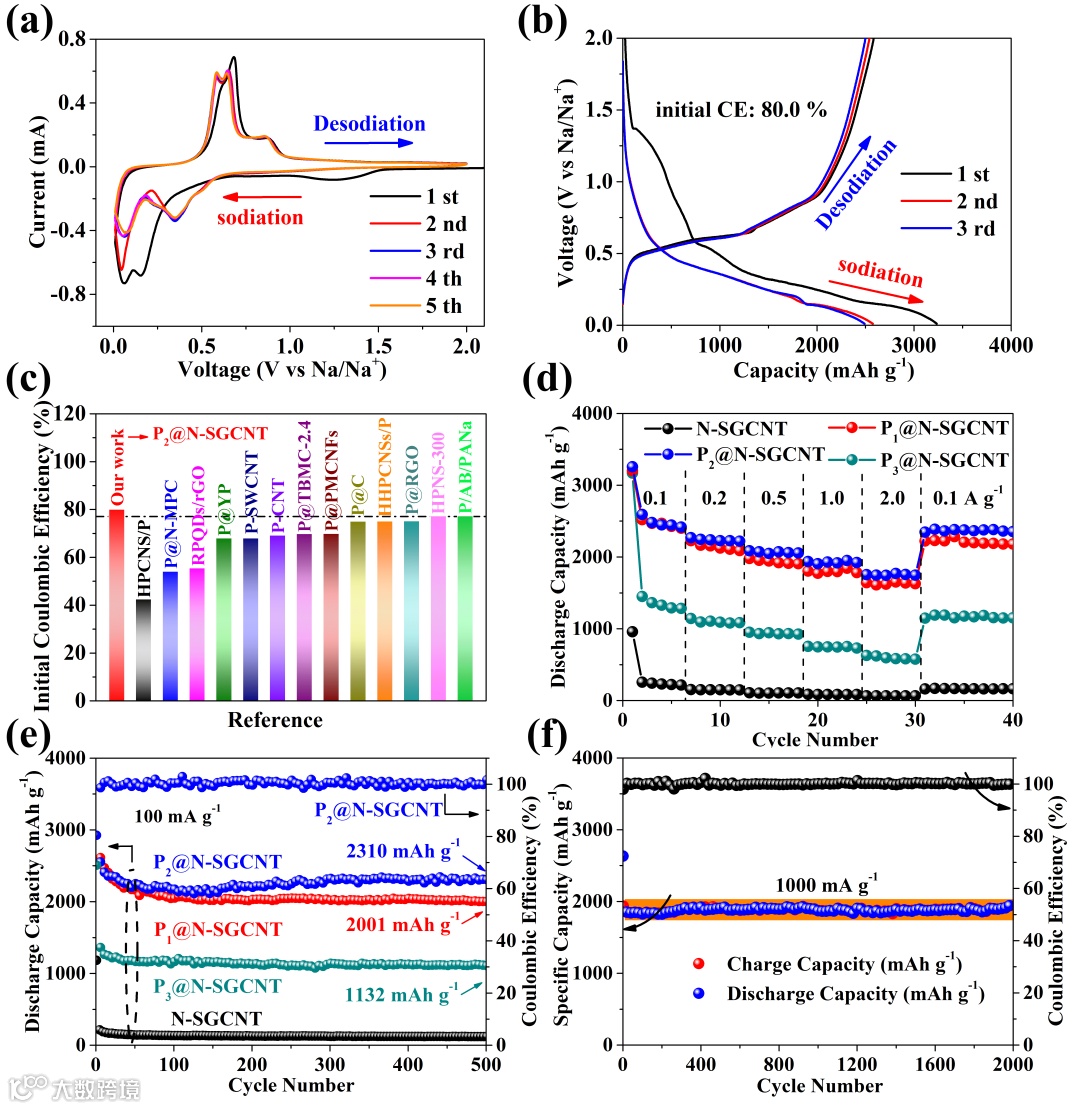 图3.P@N-SGCNT复合材料在钠离子电池中的电化学性能