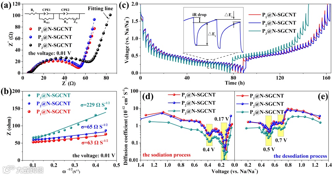 图4. P@N-SGCNT复合材料在钠离子电池中的动力学性能
