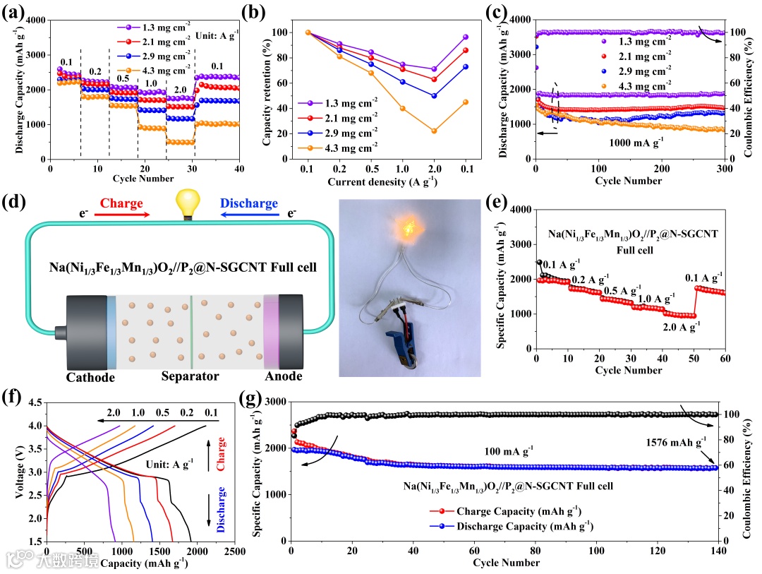 具有1D-CNT@2D-G分级结构且“完全限域“的高N掺杂P2@N-SGCNT复合材料在不同面载量下,仍具有优异的倍率性能和循环性能。将其与Na(Ni1/3Fe1/3Mn1/3)O2正极材料匹配成钠离子全电池后,同样具有优异的倍率及循环性能。在100 mA/g的电流密度下,循环140圈,仍能保持1576 mAh/g的容量。