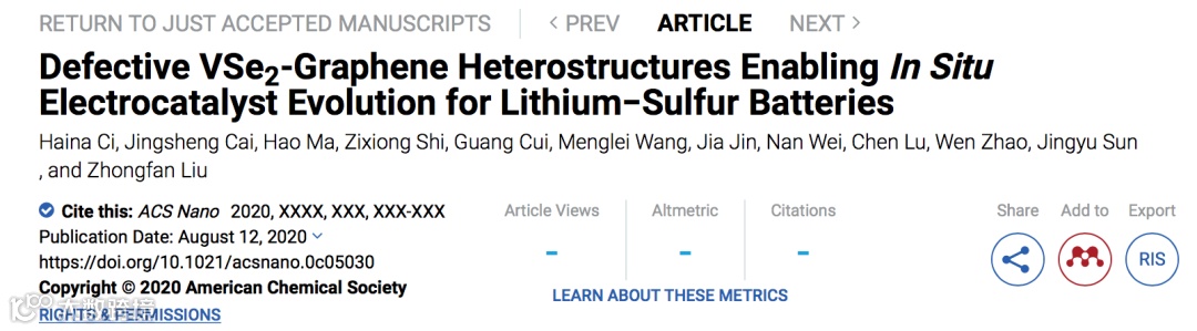 基于以上现状,苏州大学能源学院、苏州大学——北京石墨烯研究院协同创新中心的孙靖宇教授团队在ACS Nano期刊上发表题为“Defective VSe2-Graphene Heterostructures Enabling In Situ Electrocatalyst Evolution for Lithium−Sulfur Batteries”的论文。