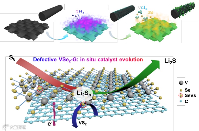 通过化学气相沉积技术,实现二维过渡金属硒化物(VSe2)-石墨烯异质结材料原位构筑,并有效利用缺陷工程助力高性能锂硫电池的原位电催化,能够对锂硫电池正极材料的合理设计提供有效借鉴。