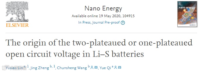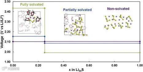 硫的电势曲线是在硫正极充电/放电期间发生的电化学反应的直接特征。有趣的是,硫正极的大多数放电曲线显示出一个平稳段或两个平稳段。通常在醚基液体电解质中观察到硫正极的两平台放电曲线。在2.3–2.4 V处的第一个平稳期被归因于从元素S到溶解的多硫化锂(Li-PS)的锂化反应。在约2.0–2.1 V处的第二个平稳期是由于溶解的Li-PS连续锂化成沉淀的结晶Li2S2和Li2S所致。相比之下,当未形成可溶性Li-PS时,单平台放电曲线(有时带有斜率)被认为是从固态S到固态Li2S2和Li2S的固态反应的特征。电解质中不存在游离溶剂。平稳的平台是由于固体电解质中的过电位。在碳酸盐基液体电解质中,S被限制在碳基体的纳米孔中,由于S被原位形成的固体电解质界面封闭在碳孔内,硫正极显示出一条平坦的放电曲线。到目前为止,还没有一致的模型可以从反应机理的角度说明两平台和单平台OCV之间的差异。