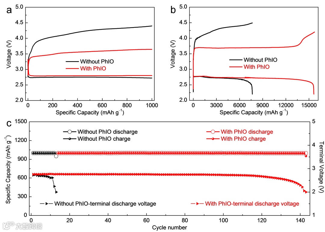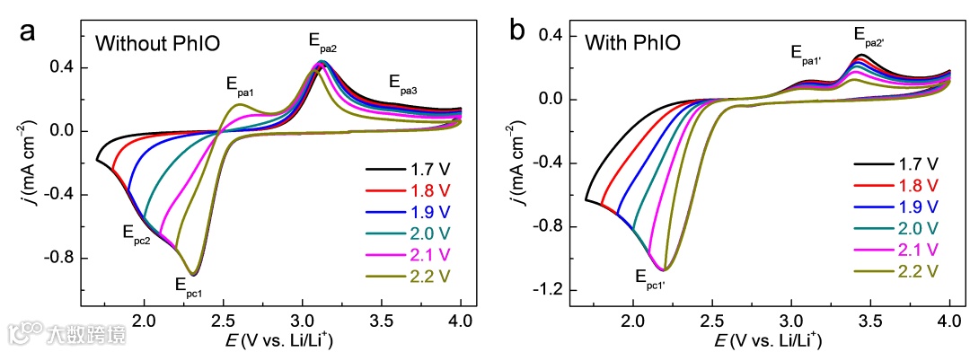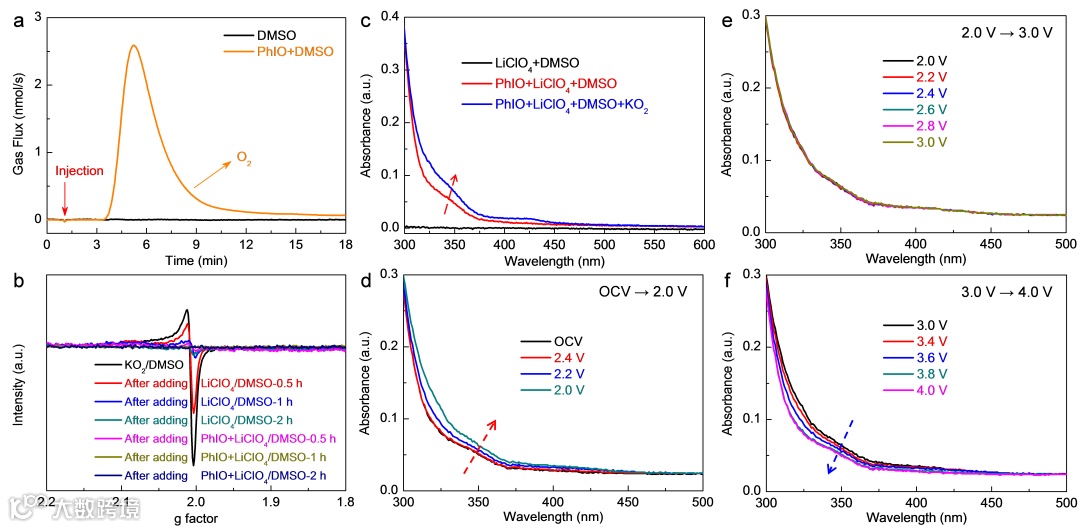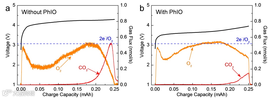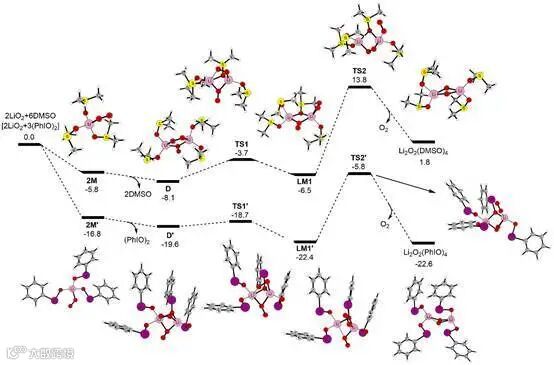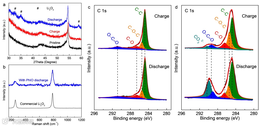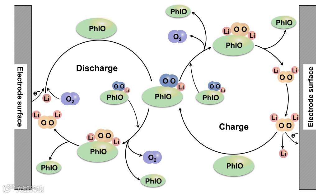 而在充电过程中,多数研究表明,在充电初始阶段,Li2O2会先通过一电子氧化反应在电极表面形成吸附态LiO2物种(Li2O2 → LiO2* + e- + Li+),由于该物种移动性较差,其倾向于在电极表面进行第二步电化学氧化反应生成O2(LiO2* → O2 + e- + Li+),该两电子过程的反应动力学较为缓慢。因而充电过电位也相对较大;而如果能使吸附态LiO2物种扩散溶解到电解液中(LiO2* → LiO2(sol)),其则会在电解液中通过歧化反应生成O2(2LiO2(sol) → Li2O2 + O2),整个Li2O2分解过程则只需经历一个只有一电子转移的电化学反应步骤(与放电过程的溶液途径相似),因此该一电子分解途径常常表现出相对较小的充电过电位。