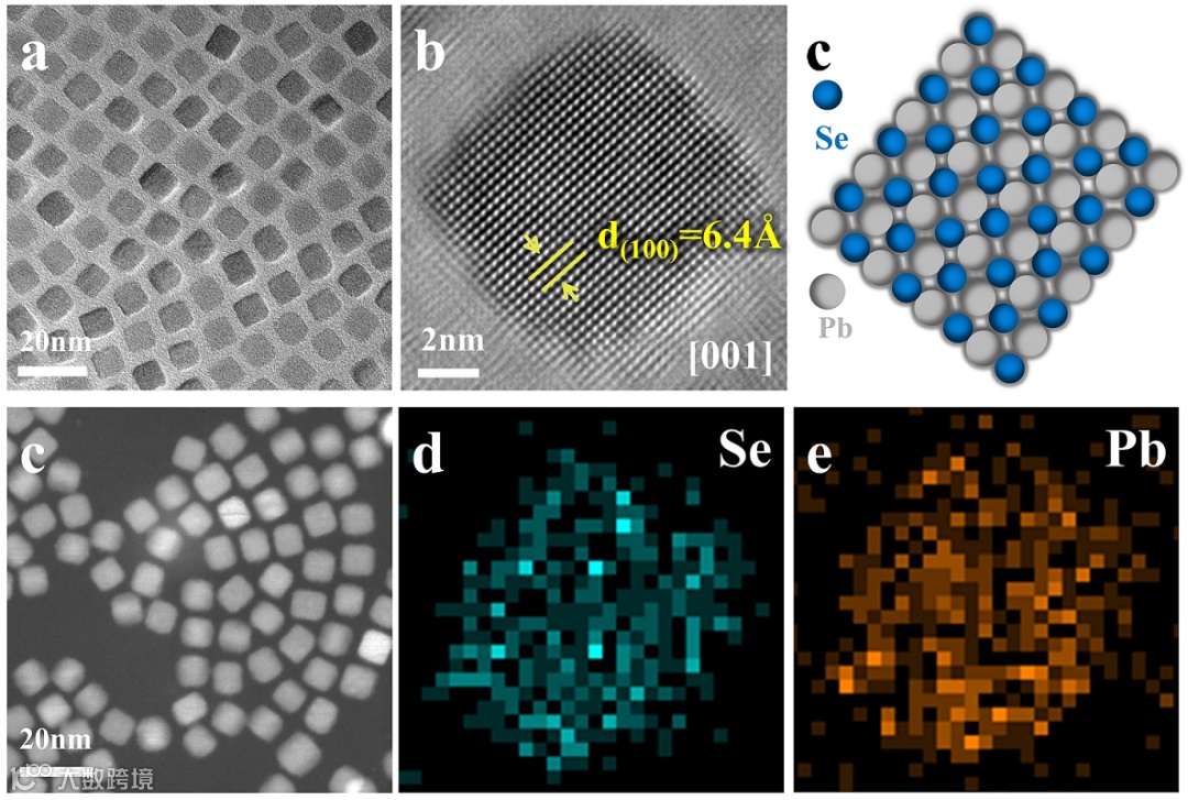 图1. PbSe纳米晶形貌、晶体结构、化学成分分析。(a)PbSe纳米晶TEM形貌图像,(b)单个PbSe纳米晶HRTEM图像,(c) PbSe纳米晶原子结构模型图,(d) PbSe纳米晶HAADF图像,(e)和(f)为单个纳米晶中Se和Pb元素对应的面分布图。