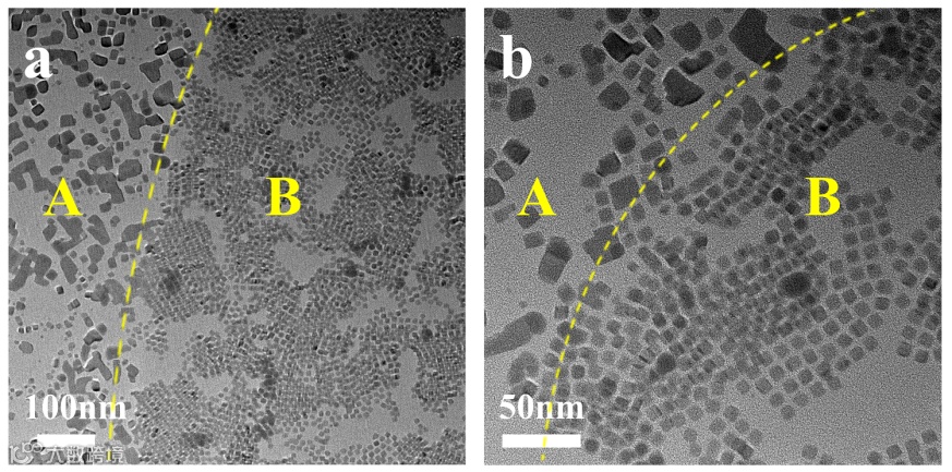 图2. 300 ℃加热情况下PbSe纳米晶的TEM图像,其中B区域为电子束辐照区域。