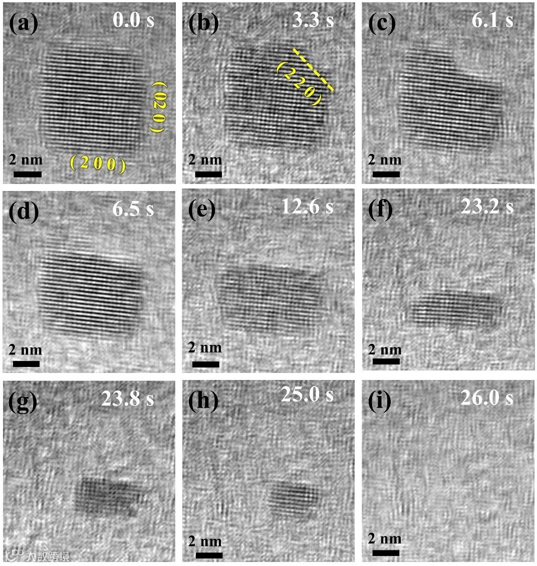 图3. 单个PbSe纳米晶升华过程。(a-i)电子束辐照下单个小尺寸PbSe纳米晶升华过程的HRTEM图像,对应加热温度为650℃。
