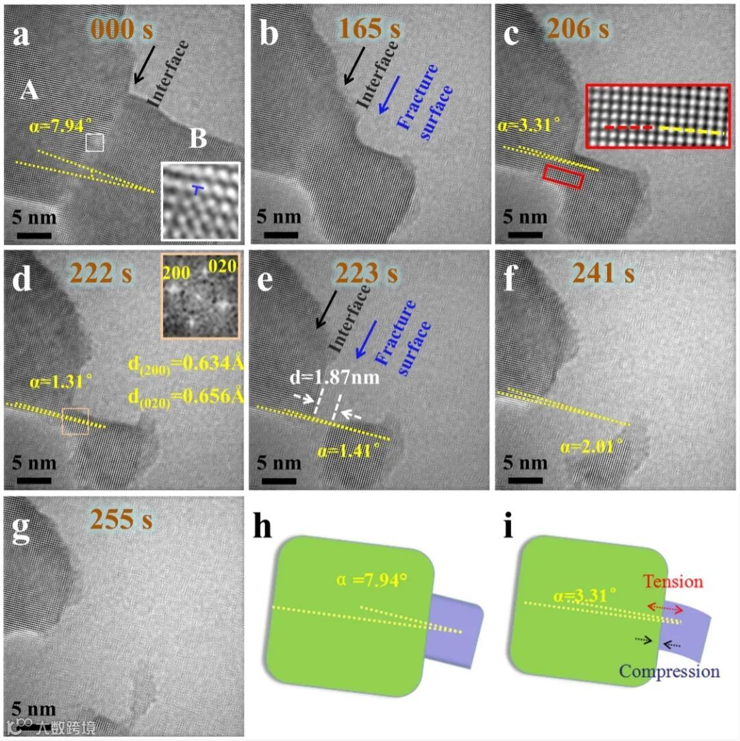 图5.大尺寸PbSe纳米晶接触界面附近的升华过程,由相接触的两个小尺寸纳米晶在300℃加热半小时后得到大尺寸纳米晶的初始态。(a-g)650℃时大尺寸PbSe纳米晶升华的不同时刻HRTEM图像,(h-i)纳米晶升华过程中应力分布示意图。