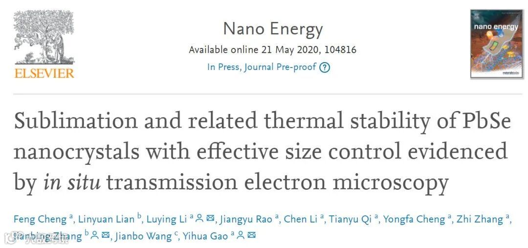 近日综合科学类权威学术期刊《纳米能源》(Nano Energy)在线发表了武汉光电国家研究中心李露颖副教授,高义华教授与光电学院张建兵副教授合作的最新研究成果“尺寸可调的PbSe纳米晶升华及热力学稳定性的原位透射电子显微学研究”(Sublimation and related thermal stability of PbSe nanocrystals with effective size control evidenced by in situ transmission electron microscopy)。