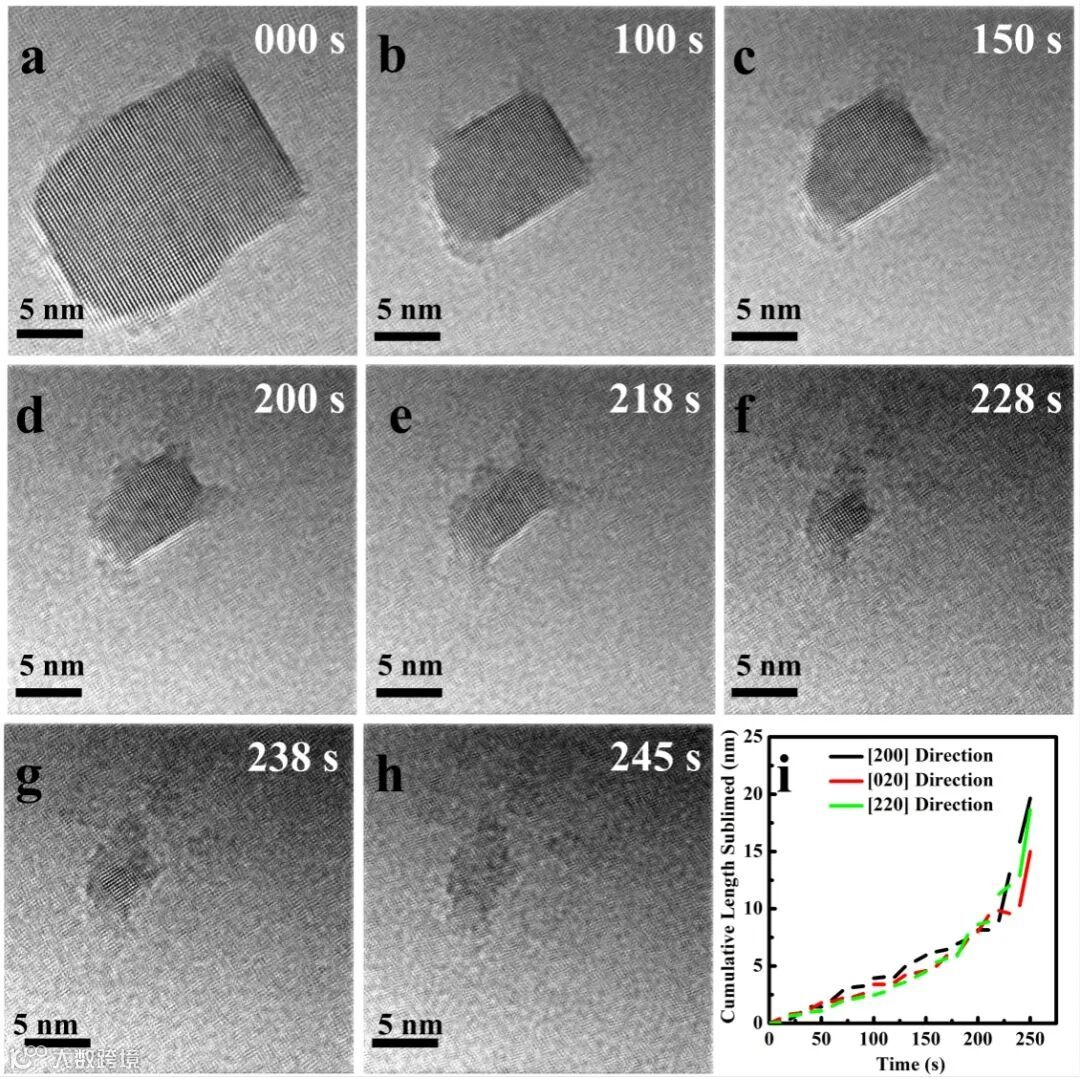 图4. 650℃时大尺寸PbSe纳米晶的升华过程。(a-h)大尺寸PbSe纳米晶升华过程中不同时刻的HRTEM图像,(i)不同时刻和不同晶面的PbSe纳米晶的升华长度。