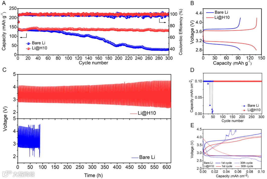 (A)Li@H10和未保护的锂用于Li-LFP电池在1C下的循环性能。