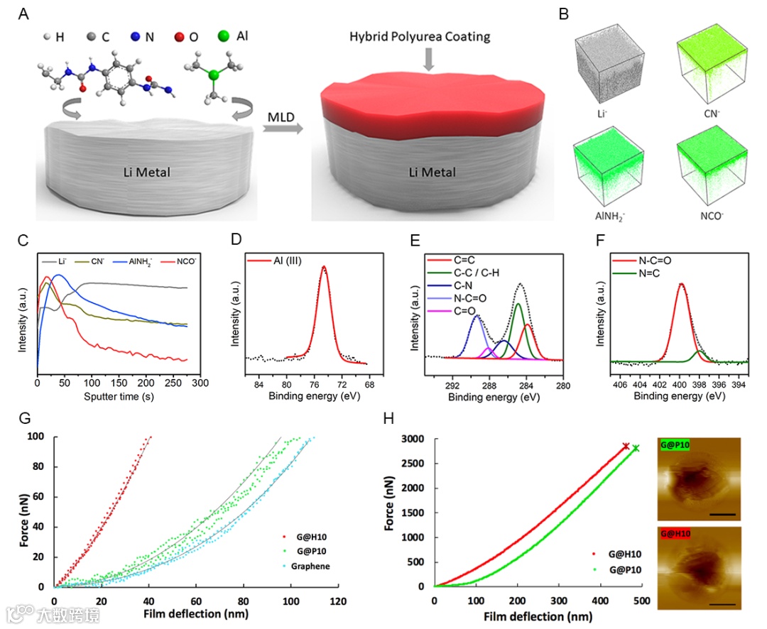 Li@H10的(D)Al 2p,(E)C 1s,和(F)N 1s的XPS谱(G)机械性能测试中H10和P10在弹性区域的应力-应变(F-δ)曲线(H)直至薄膜失效时的F-δ曲线以及失效时的AFM图像,比例尺的长度为1微米。