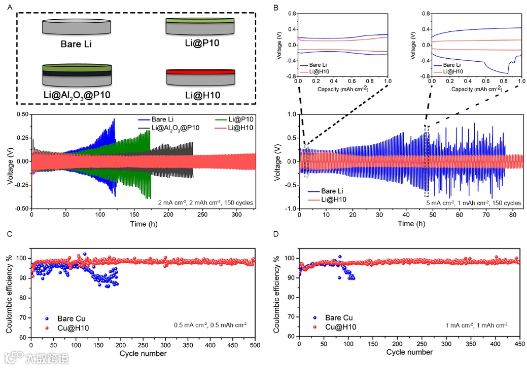 (A)分别由未保护锂片,Li@P10,Li@Al2O3@P10,以及Li@H10组成的对称电池中在2mA cm-2电流下的循环性能