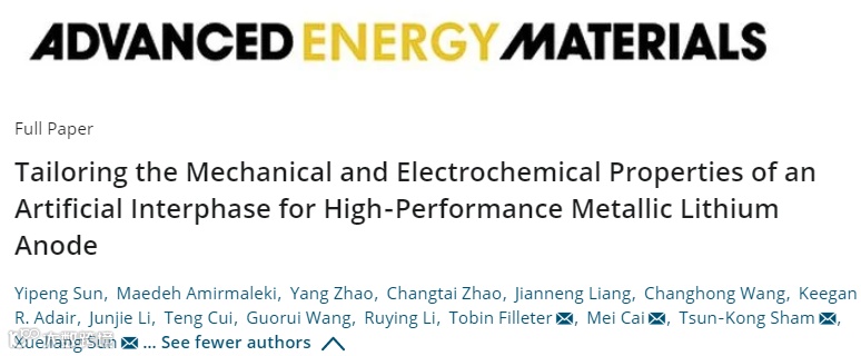近日,加拿大西安大略大学孙学良教授与Tsun-Kong Sham教授课题组共同报道,并与加拿大多伦多大学Tobin Filleter教授课题组和通用汽车研发中心蔡梅博士课题组合作,在国际顶级期刊Advanced Energy Materials上发表为Tailoring the Mechanical and Electrochemical Properties of an Artificial Interphase for High-Performance Metallic Lithium Anode的研究工作。该文章第一作者为博士生孙一芃和博士生Maedeh Amirmaleki。