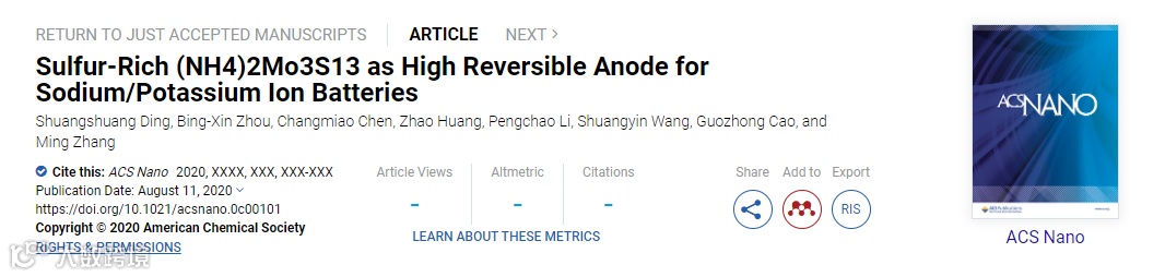 近日,湖南大学张明教授课题组在国际顶级期刊ACS Nano (影响因子:13.903) 上发表题为“Sulfur-Rich (NH4)2Mo3S13 as High Reversible Anode for Sodium/Potassium Ion Batteries”的研究工作。
