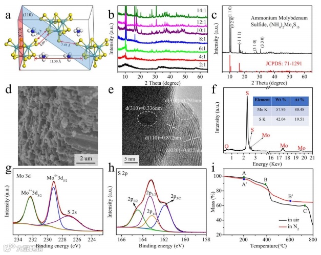 该工作提出将富硫的(NH4)2Mo3S13作为SIB/PIB电池的负极,并通过水热法获得。具有三维结构的富硫(NH4)2Mo3S13显示出高容量,长寿命的Na+(在1100次循环后容量为165.2 mAh g-1在10 A g-1下)和K+(120.7 mAh g-1)在500 A循环后保留1 A g-1的浓度。