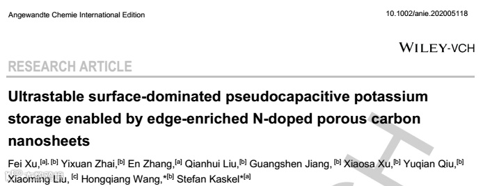 在这方面,N掺杂,特别是通过掺杂实验和理论证明,N(吡啶/吡咯构型)因具有丰富的负电子缺陷位点和较高的吸附能,可以有效吸附K离子。尽管进行了大量的研究,但因掺杂过程中N的不受控制导致N元素不能在碳材料成为有序的边型N。设计含有特定边型N的前驱体有可能促进在生成碳中富含边型N,例如使用具有增强容量和循环能力的聚吡咯衍生碳。然而,在衰减率(<0.002%)较小的情况下,仍有足够的空间进一步提高循环性能。限制循环稳定性的可能原因一方面是不能合理地构边型N的结构。另一方面是两种结构特征的权衡,很难构建同时具有高表面积和边型N的碳材料。此外,空间上N的分布或掺杂深度也会影响K存储性能,在这方面很少有研究关注。因此,精心设计边型N的碳材料仍有可能获得同时保持稳定循环性能和倍率性能的高容量钾离子存储系统。