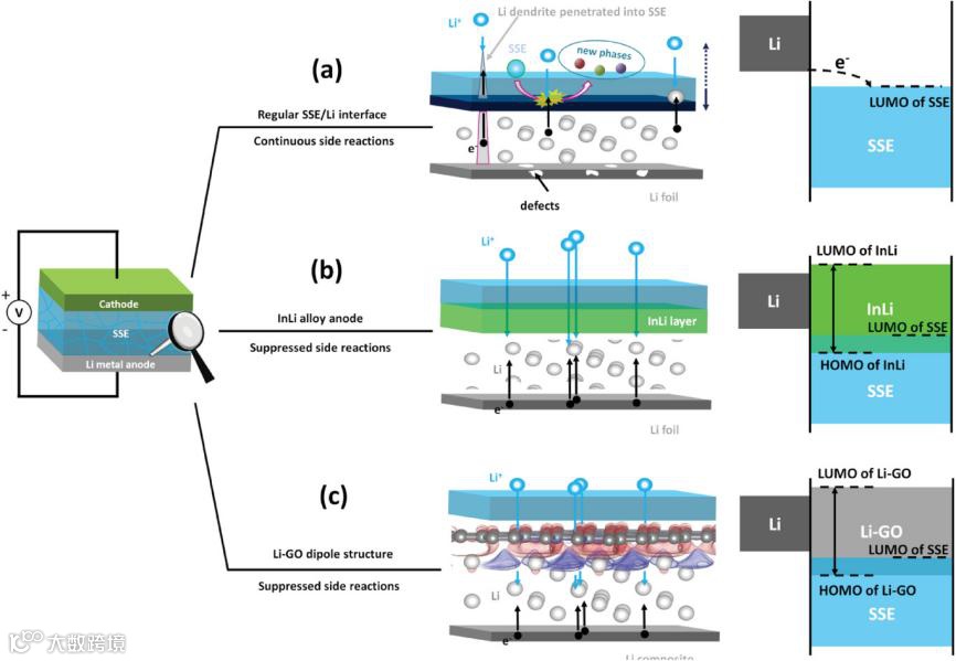 基于我们团队的工作(Advanced Energy Materials, 2019, 1802912),我们期待GO纳米片的直接使用,不需要额外的水热等一系列工序。因此先利用DFT对锂在GO上的沉积进行研究,发现有Li-GO偶极子结构的形成,提高界面LUMO能级,可以改善界面不稳定问题,这是本工作最为核心的部分。如何实现Li-GO偶极子结构作用的有效发挥是另外一个问题,我们是借鉴了电镀工艺通过共沉积的方法将GO负载到3D集流体上。