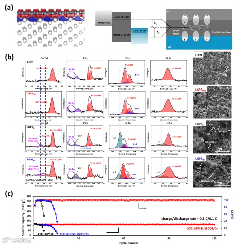 目前已有大量的工作报导液态电池中锂金属的保护策略,也取得了有益效果。固态电池中的锂金属/界面问题也是被重点关注的关键问题,在已有报道中,通常是对平板电极的表面改性,较难兼顾锂金属体积变化、固固界面物理接触和界面副反应三个问题。在本工作中,我们利用Li-GO偶极子结构可以抑制界面副反应的重要作用,协同巧妙设计具有亲锂性的3D集流体,在硫化物固态电池中实现了应用,有效地抑制界面副反应、缓解循环体积变化、改善界面物理接触,显著地提高了电池的循环性能。另外,这种材料合成方法简便易行,可以不使用昂贵的铟金属,但体现出于InLi合金相当的性能,存在能量密度优势和成本优势。