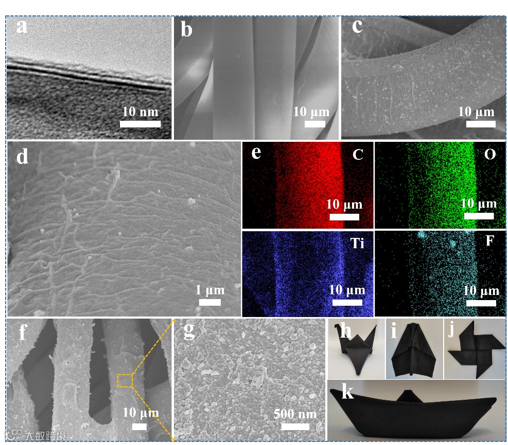 (a) TEM image of MXene. SEM images of (b) PMFF and (c,d) MXene/PMFF. (e) EDS mappings of C, O, Ti, and F for MXene/PMFF. (f,g) SEM images of PPy/MXene/PMFF. (h–k) Photographs of PPy/MXene/PMFF electrodes with flexible, rollable and foldable properties.