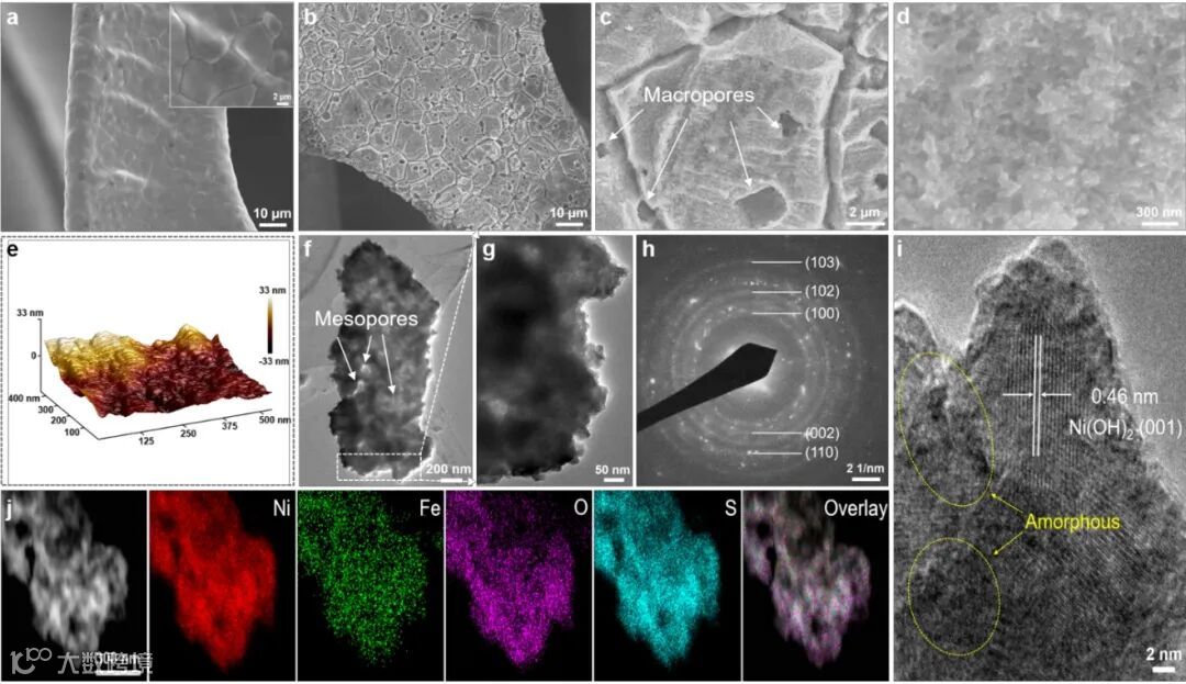 图1给出了S-(Ni,Fe)OOH电极的微观形貌和纳米结构。图1(a)是商业化泡沫镍的SEM图像,其表面光滑;图1(b-d)中的SEM图像显示S-(Ni,Fe)OOH电极表面十分粗糙且有不同尺寸的孔洞,高分辨图像进一步显示S-(Ni,Fe)OOH是由纳米颗粒组成。图1(e)中的AFM图像显示S-(Ni,Fe)OOH电极表面有高低不平的三维结构。