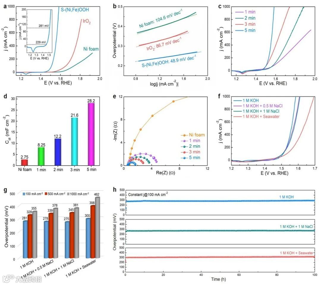 综上所述,作者报道了一种节能省时的简单方法,制备了一种具有高析氧活性和良好稳定性的S-(Ni,Fe)OOH电极。该电极同时在碱性盐水和碱性海水中展现出优异的OER性能。本研究极大推动了电解水制氢和海水淡化技术的发展。