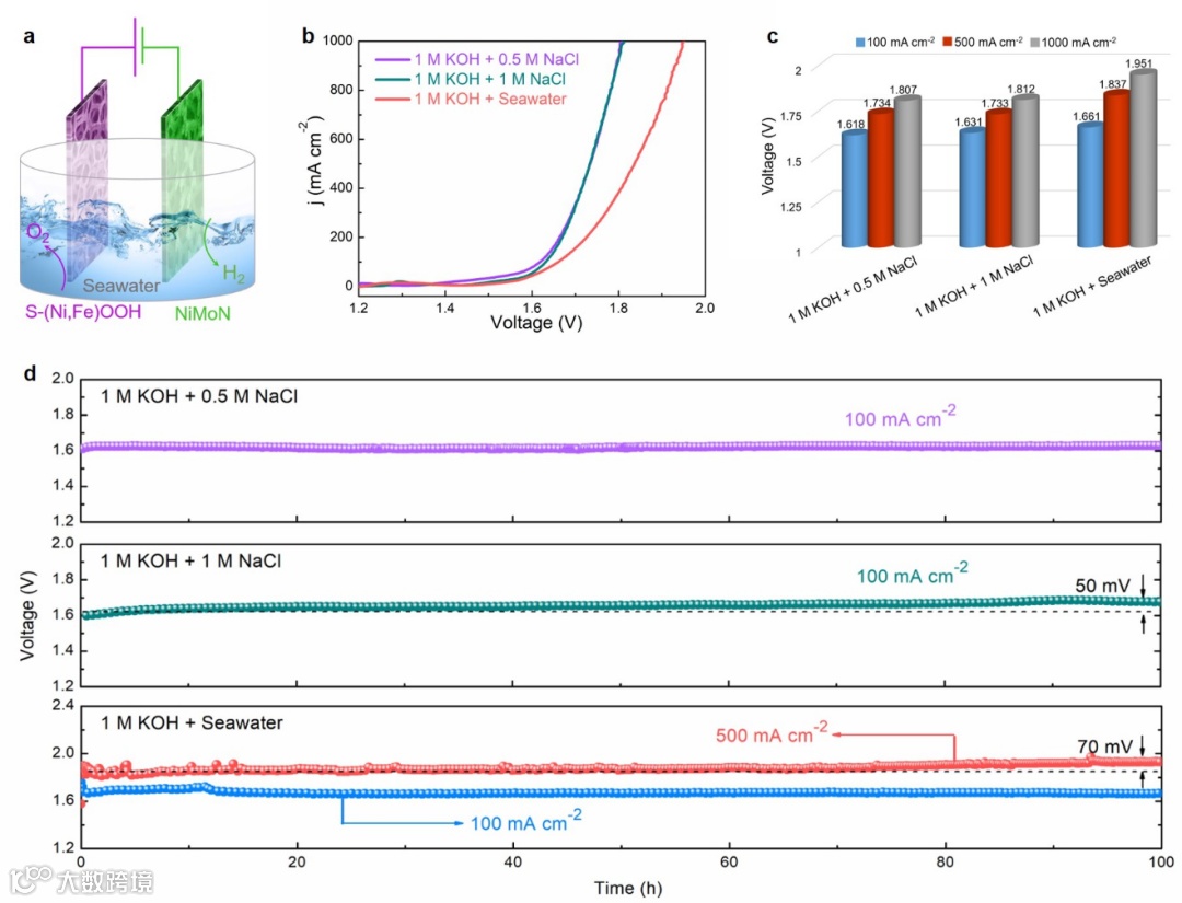 我们将S-(Ni,Fe)OOH催化剂用作阳极,另外一个高效的NiMoN催化剂用作阴极,搭建两电极碱性电解槽进行电解海水测试,图4(a)给出了该电解槽的结构示意图。