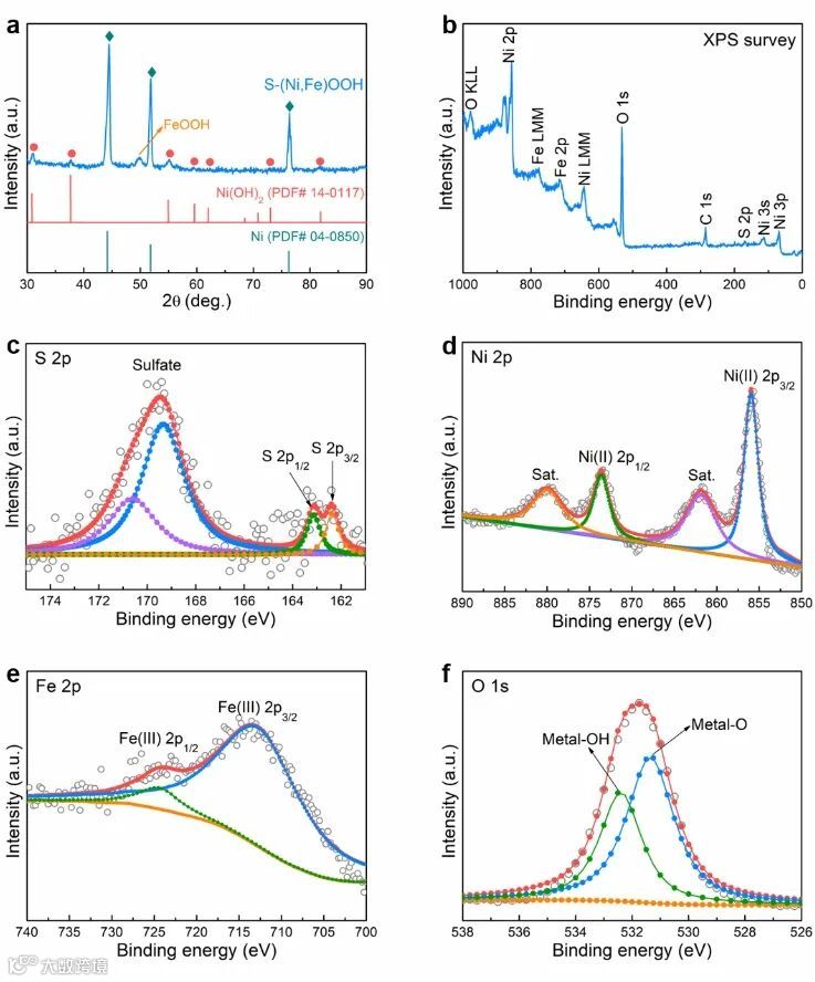 图2. S-(Ni,Fe)OOH电极的物相和元素化学状态表征