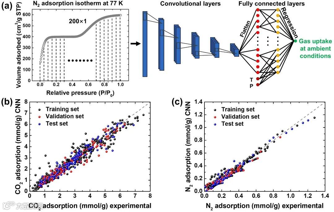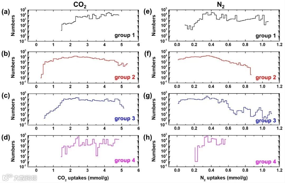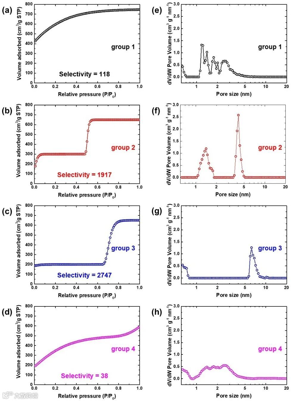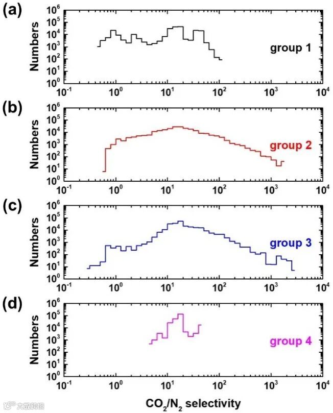 随后,作者从每组中选出具有最高CO2/N2选择性的多孔碳材料,分析它们的77K下的N2吸附等温曲线和孔径分布图(图4)。这能够帮助人们发现较高选择性的来源,同时,总结出相应的孔径分布规律。第二组和第三组的孔径分布具有明显的双峰特征,分别位于微孔区域(小于2纳米)和介孔区域(3-7纳米);而第一组和第四组的孔径分布则是连续的宽峰,并且以微孔为主。这说明孔径分布分割清晰的微孔和介孔有助于增强选择性,因为微孔十分有利于CO2的吸附,同时介孔能够阻断并减少N2的吸附。