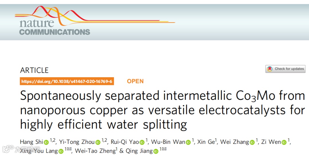 近日,吉林大学蒋青教授,郎兴友教授。吉林大学的蒋青团队在国际知名期刊Nature Communications(2018 影响因子:)上发表题为“Spontaneously separated intermetallic Co3Mo from nanoporous copper as versatile electrocatalysts for highly efficient water splitting”的研究工作。该工作报道了金属间化合物Co3Mo纳米颗粒在化学脱合金过程中通过自发相分离无缝集成在分级纳米孔Cu骨架(Co3Mo/Cu)表面,作为碱性介质中原位羟基化和电氧化的高性能HER/OER电催化剂。Hang Shi, Yi-Tong Zhou为本文的共同第一作者。