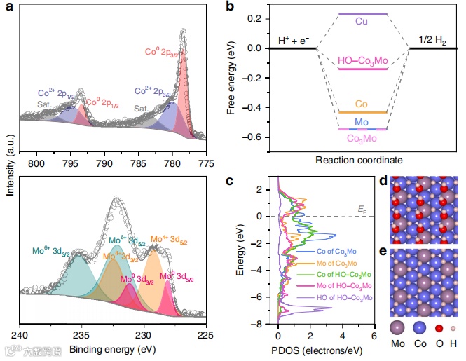 图2a显示了纳米多孔Co3Mo/Cu电极中的Co 2p和Mo 3d XPS光谱。除了与Co3Mo中内部Co和Mo原子相对应的金属状态外,表面Co原子还表现出Co2 +态。