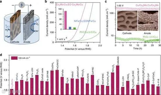 纳米孔Co3Mo/Cu及其电氧化衍生物在HER和OER中的优异电催化性能表明,它们在实际的水电解中显示出作为阴极和阳极材料的真正潜力(图5a)。